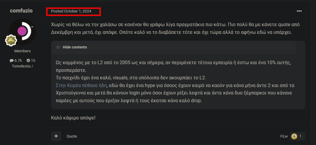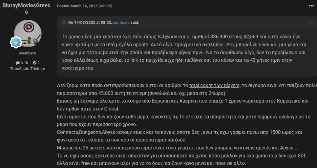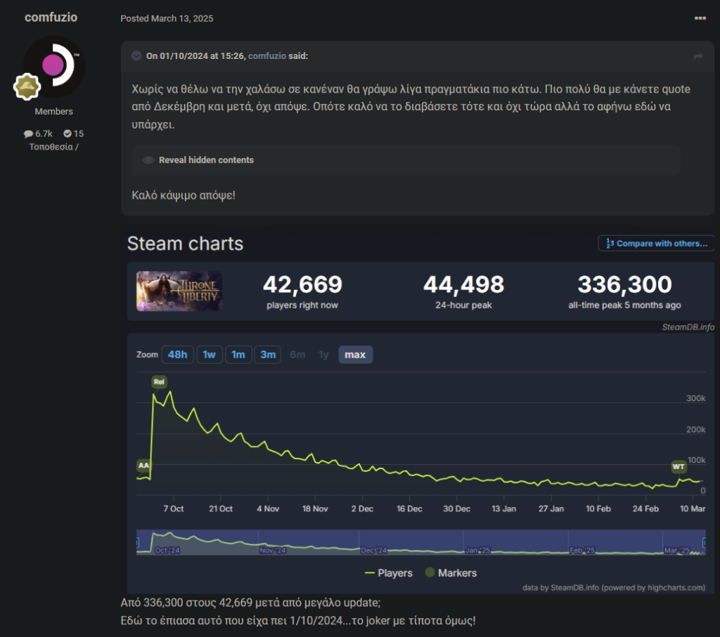 Please note the date, October 1st 2024, right then I have written that this game would be dead soon after it launched, I have even posted a link that the game was already dead in Korea. Just months after it launched. I made a prediction and I have asked people not to quote me directly on the same day but after December of that year. Sure I couldn’t predict the exact date it will die with 100% accuracy but I thought it will keep people for the holidays and a bit after, hence the “after December”, granted, I could or should have said after the holidays or after January.